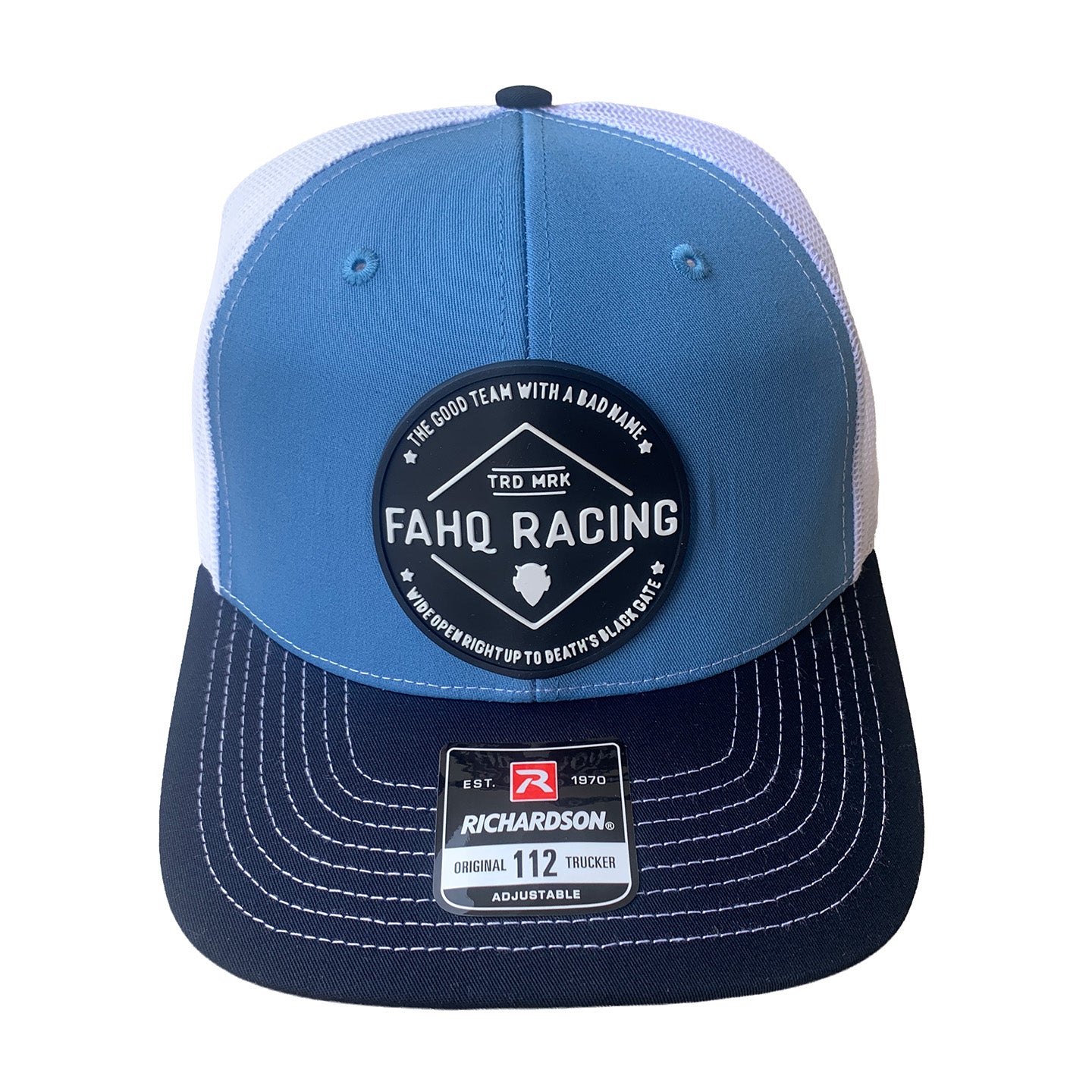 Grab this Richardson 112 cap and level up your hat game. Featuring a vibrant Carolina blue front with a sleek black brim, plus a ventilated white mesh back to keep your head cool. The custom PVC rubber patch seals the deal. style that stays on while you pin it to win it. The Good Team with a Bad Name FAHQ RACING